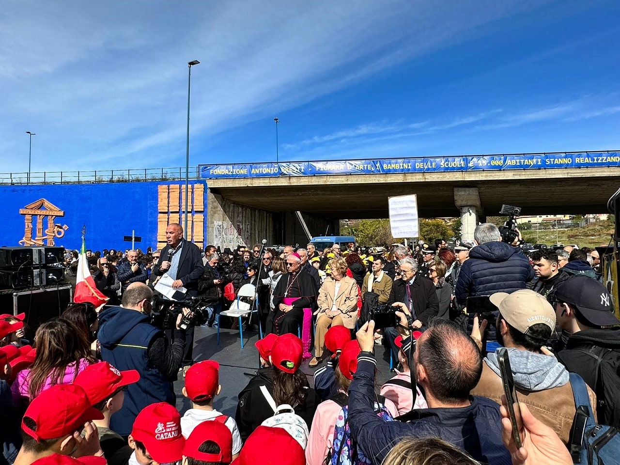 CATANIA – «L’Arte non cerca voti ma devoti. E la presenza di migliaia di persone, oggi qui, è testimonianza di devozione verso la Bellezza. Librino si è riscattata agli occhi del mondo: ha preso il volo, proprio come le farfalle di questa nostra Opera collettiva, che oggi con leggerezza volteggiano sopra il cielo della città di Catania». Con queste parole il mecenate Antonio Presti ha inaugurato la più grande opera monumentale al mondo in bassorilievo ceramico, alla presenza di migliaia di mamme e bambini delle scuole siciliane, che hanno partecipato a una festa dove musica e colori hanno incorniciato Etica e Cultura.